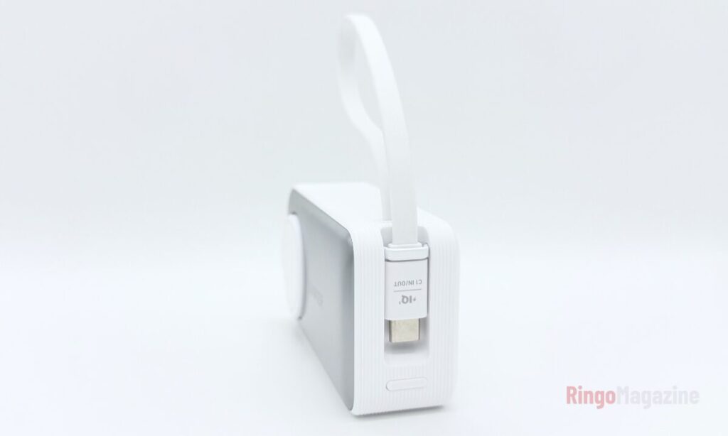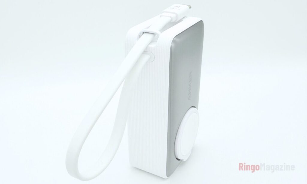 このモバイルバッテリーの大きな特徴が、USB-Cケーブルが本体に内蔵されていることです。ケーブルは本体側面に収納されており、使用時は引き出すだけ。マグネットで固定される仕組みになっているため、使わないときはスッキリと収まります。